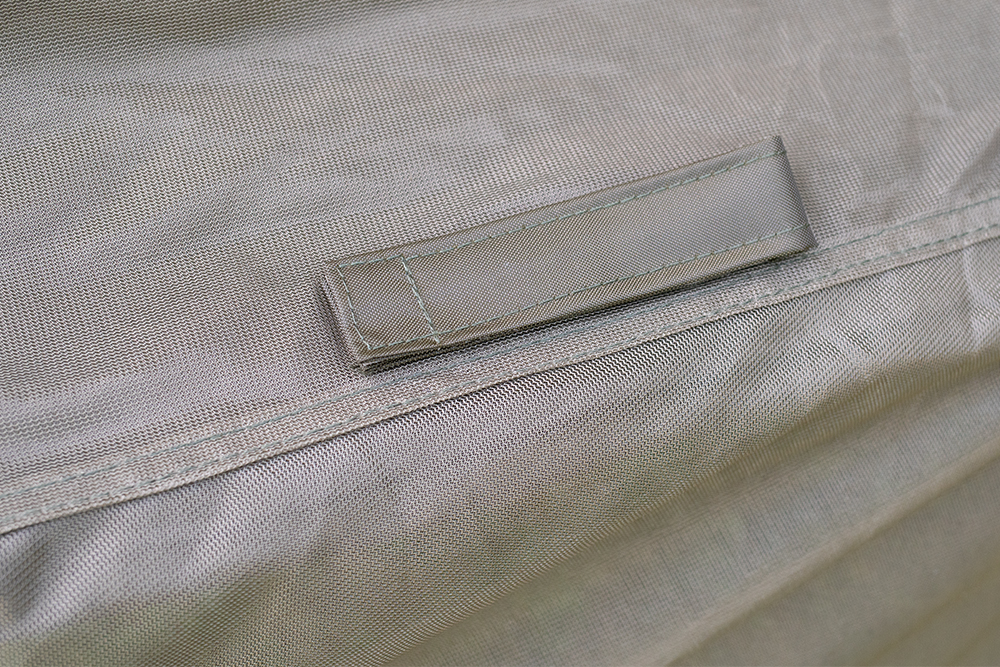 The Mozzy Drape is of a unique design. It attaches to the front of the brolly using toggles through the eyelets on the brolly and is then pegged at each side. The elastic cord running the length of the mesh can be tightened so it is a snug fit around the brolly and the fine mesh simply hangs down with the aid of small weights located around the bottom edge. The drape provides excellent protection from biting insects on warm summer nights but is easy to enter and exit simply by lifting up the mesh and then dropping it down behind you. This means that there are no zips or magnets that remain open after a hasty exit when the angler is playing a fish so that no mozzy’s can simply fly inside the brolly. The Mozzy Drapes both weigh under 1kg and are supplied in a handy draw string bag.